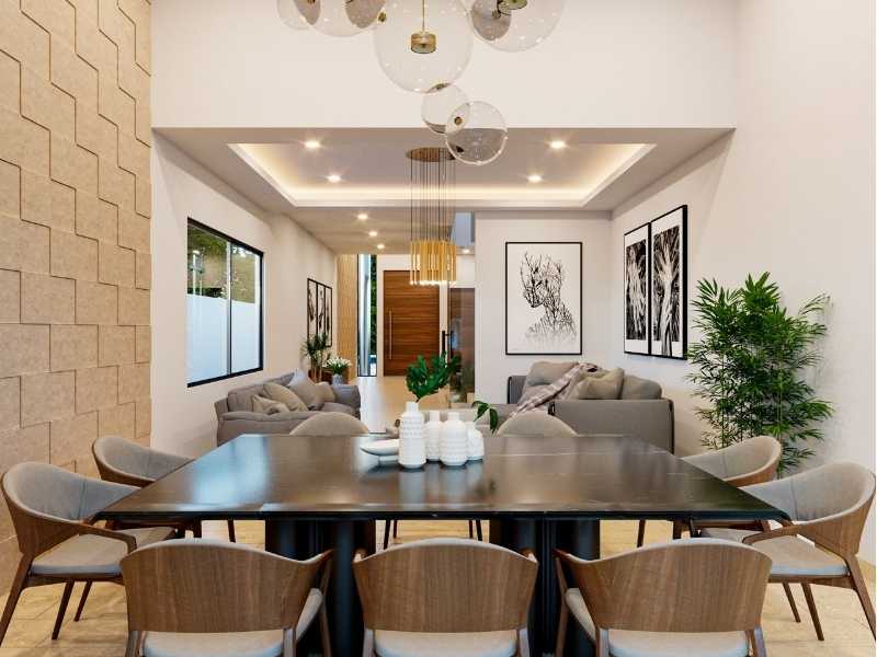 Sala comedor corrida con vista a la alberca y jardín
